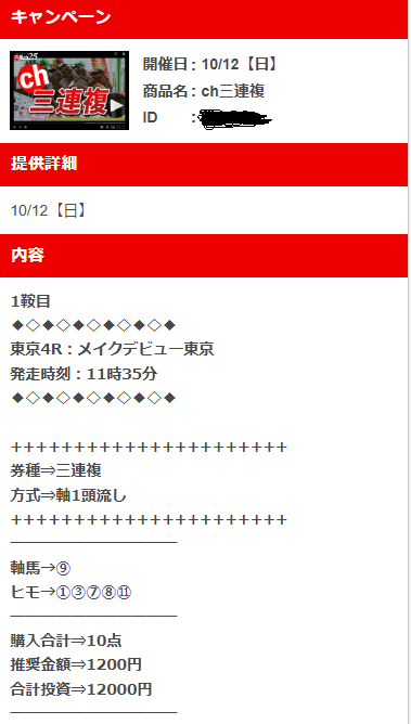 穴馬チャンネルさん無料情報でも出し惜しみしない穴馬情報ありがとうございます。 2着に入った10番人気お見事でした、3連複的中ありがとうございます。 配当も十分満足いく6万8700円ありがとうございました。 穴馬が馬券入ると感情では表せられない喜びがありました!